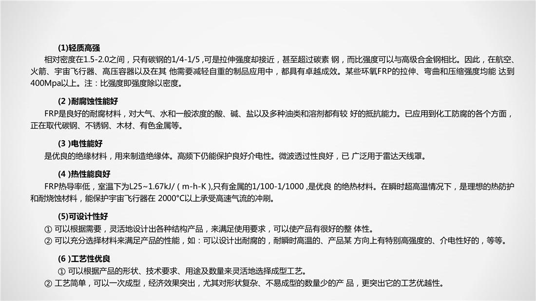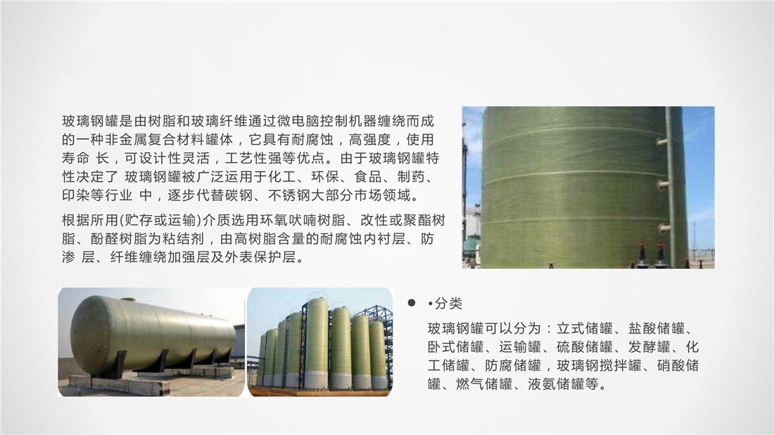 • 产品描述:玻璃钢罐是由树脂和玻璃纤维通过微电脑控制机器缠绕而成 的一种非金属复合材料罐体,它具有耐腐蚀,高强度,使用寿命 长,可设计性灵活,工艺性强等优点。由于玻璃钢罐特性决定了 玻璃钢罐被广泛运用于化工、环保、食品、制药、印染等行业 中,逐步代替碳钢、不锈钢大部分市场领域。