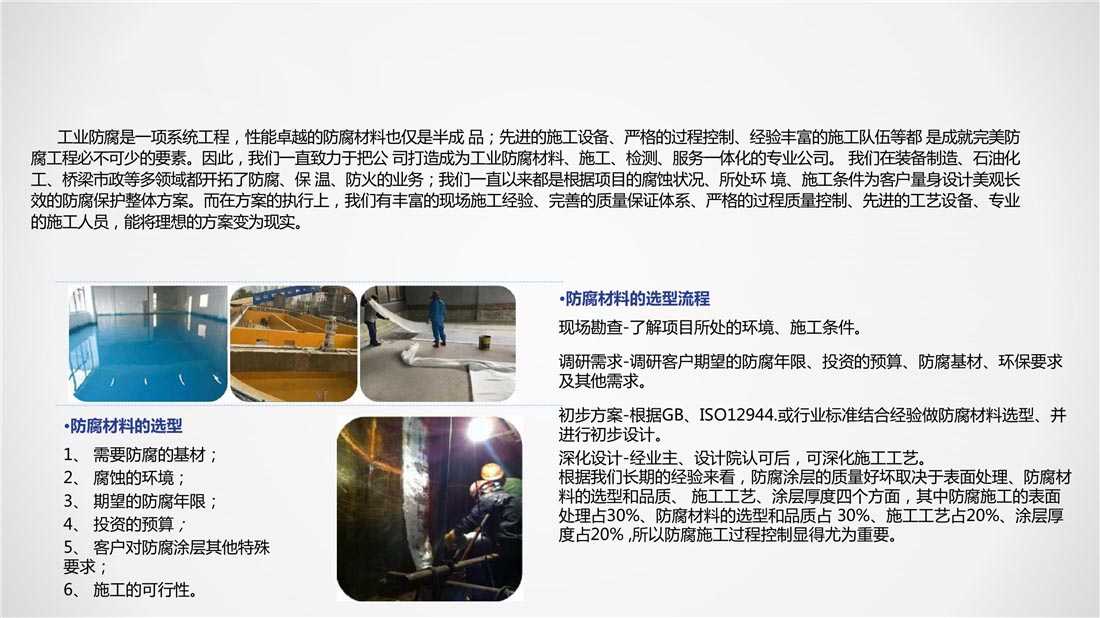 • 产品描述:工业防腐是一项系统工程,性能卓越的防腐材料也仅是半成 品;先进的施工设备、严格的过程控制、经验丰富的施工队伍等都 是成就完美防腐工程必不可少的要素。因此,我们一直致力于把公 司打造成为工业防腐材料、施工、检测、服务一体化的专业公司。 我们在装备制造、石油化工、桥梁市政等多领域都开拓了防腐、保 温、防火的业务;我们一直以来都是根据项目的腐蚀状况、所处环 境、施工条件为客户量身设计美观长效的防腐保护整体方案。而在方案的执行上,我们有丰富的现场施工经验、完善的质量保证体系、严格的过程质量控制、先进的工艺设备、专业的施工人员,能将理想的方案变为现实。