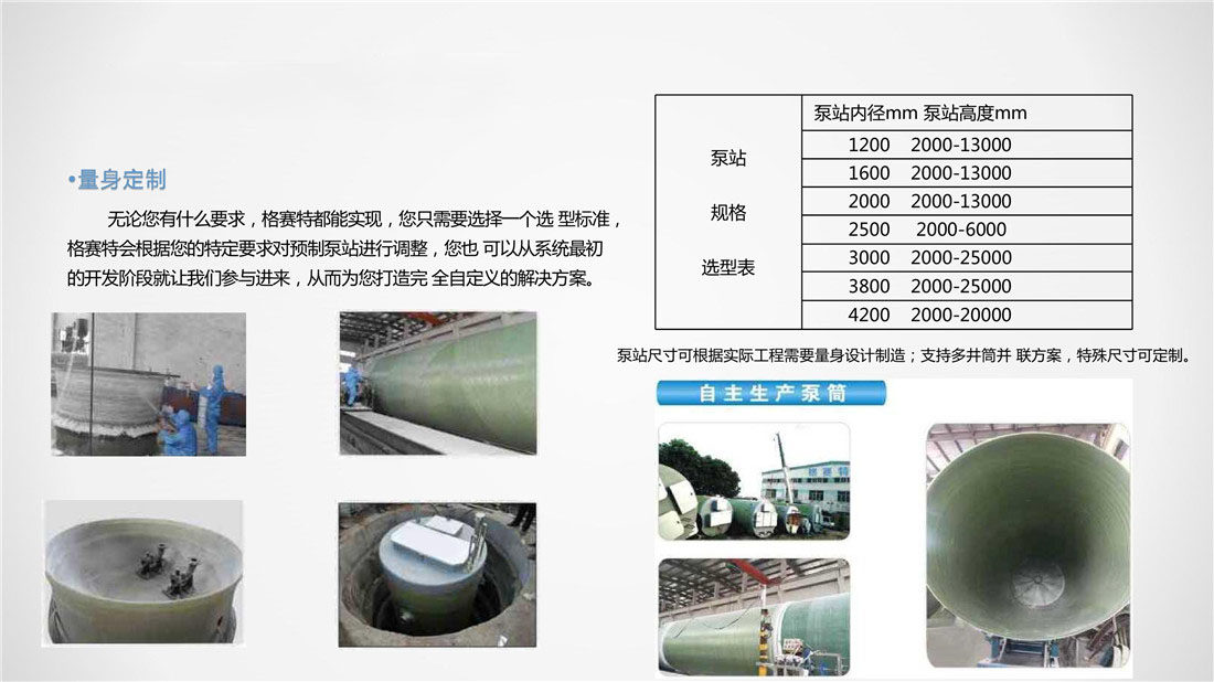 • 产品描述:一体化预制泵站是一种新型的地埋式污水、雨水、给 水收集及提升系统。主体为复合缠绕玻璃钢筒体,筒体防腐 能力强。它安装方便,质量可靠,工程施工量少,占地面积 少,自动化程度高,是传统混凝土泵站的替代品,集成度 高、容积优化是显著特点。一体化预制泵站主体由GRP玻璃 钢井筒、潜水/给水泵、提升链、管道、阀门、液位传感 器、控制系统、格栅系统和通风系统等部件组成。根据不同 工况选择合适的配置,以适应使用条件。