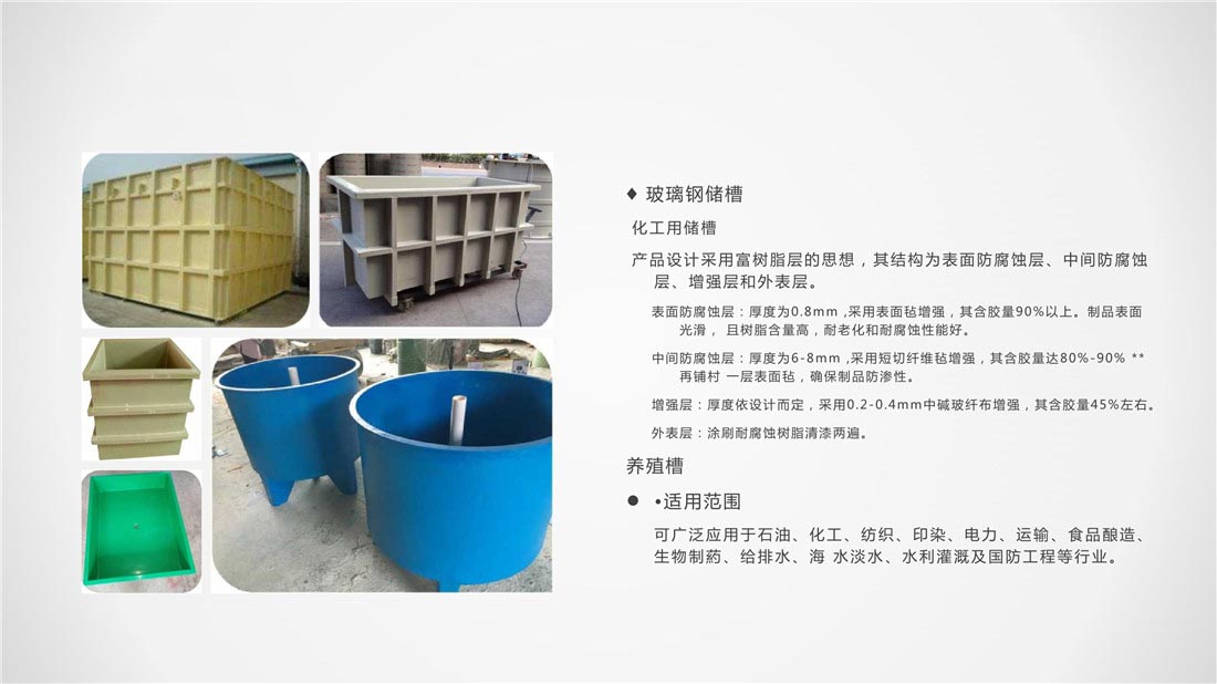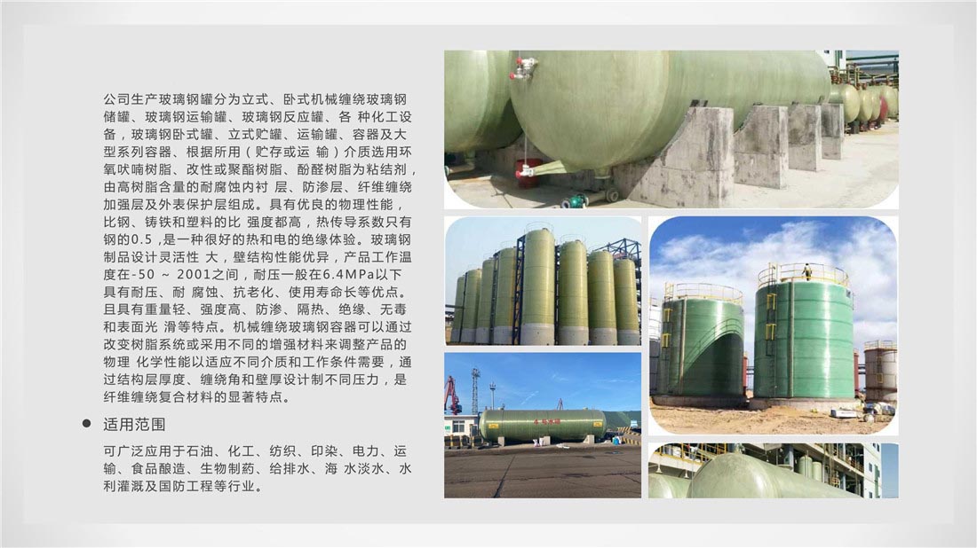 • 产品描述:玻璃钢罐是由树脂和玻璃纤维通过微电脑控制机器缠绕而成 的一种非金属复合材料罐体,它具有耐腐蚀,高强度,使用寿命 长,可设计性灵活,工艺性强等优点。由于玻璃钢罐特性决定了 玻璃钢罐被广泛运用于化工、环保、食品、制药、印染等行业 中,逐步代替碳钢、不锈钢大部分市场领域。
